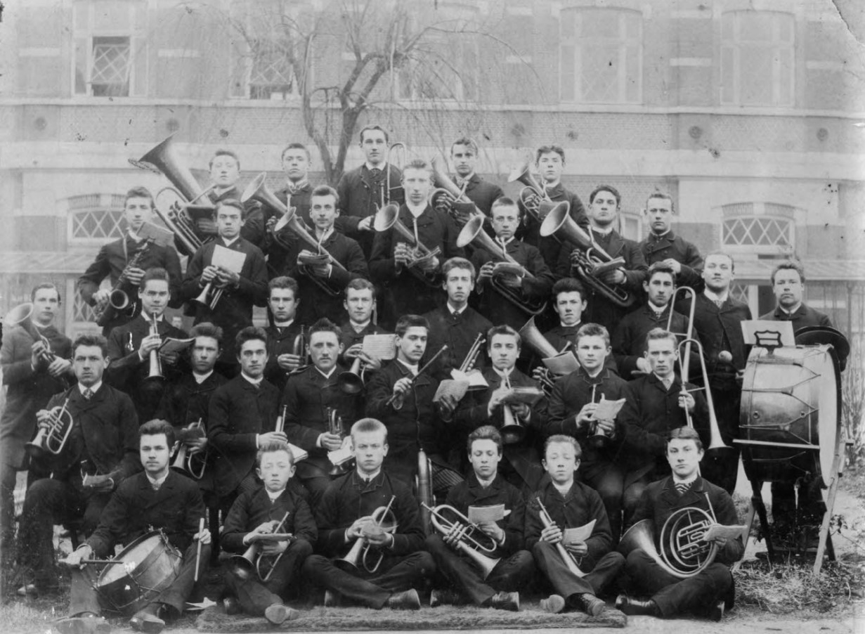 Fanfare van de Rijksnormaalschool in Lier. De foto werd genomen op de binnenkoer van de school ca. 1888. (Bron: Archief Lier - www.kempenserfgoed.be, SLI001009428)