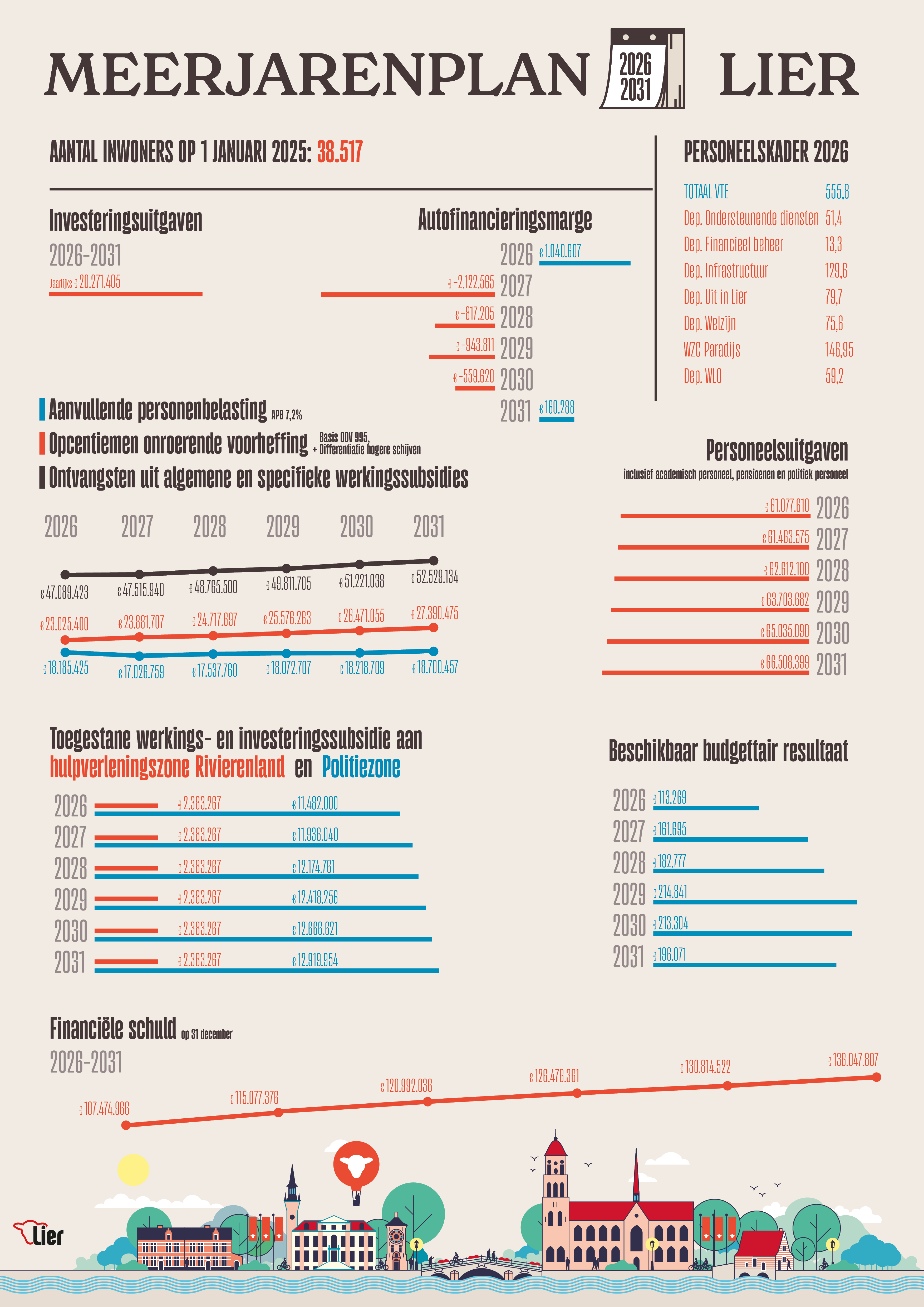 Het voorontwerp van het meerjarenplan werd op 10 november 2025 vastgesteld door het college en het managementteam, onder leiding van de algemeen directeur en financieel directeur. Het college van burgemeester en schepenen en het Vast Bureau keurden het ontwerp van de meerjarenplanning goed in de zitting van 1 december 2025 en maakten het nadien over aan de Gemeente- en OCMW-raad. De definitieve goedkeuring van de meerjarenplanning 2026-2031 vond plaats op 15 december 2025 door de gemeenteraad en OCMW-raad.