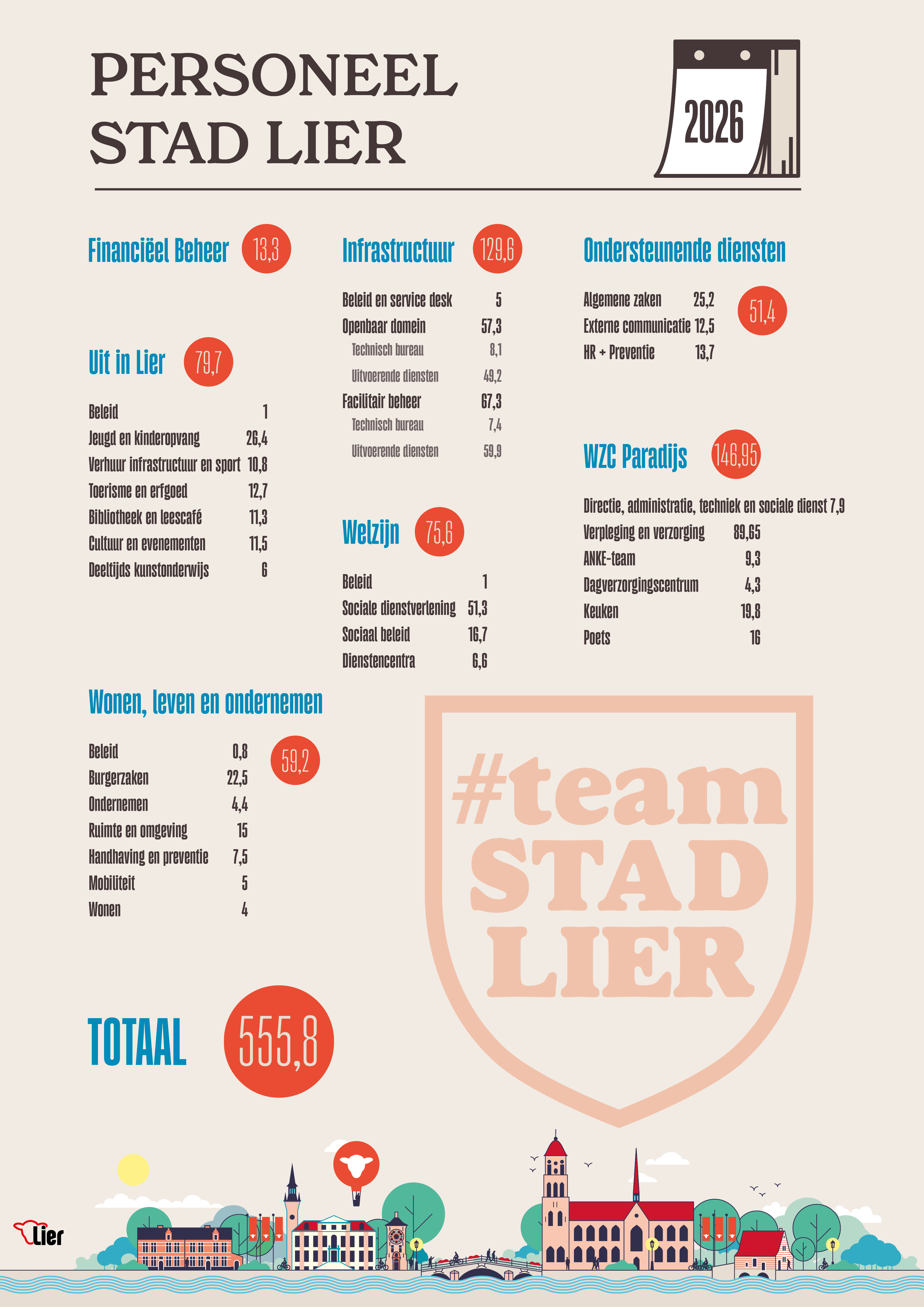 In het vooruitzicht van de nieuwe bestuurstermijn werd een projectie opgesteld van de evolutie van het personeelskader van de stad Lier tegen 2031. Deze prognose ondersteunt de strategische planning van de organisatie en past binnen de bredere ambitie om de werking structureel te optimaliseren. We willen immers een wendbare en toekomstbestendige organisatie uitbouwen die de uitdagingen van de komende jaren kan opvangen én tegelijk warme, toegankelijke dienstverlening blijft garanderen.