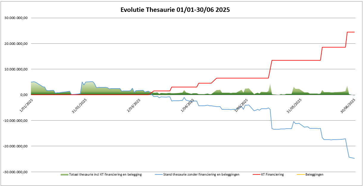 Deze grafiek geeft de evolutie van de thesaurietoestand weer in de eerste jaarhelft van 2025. Deze grafiek wordt samengesteld op groepsniveau en geeft dus de thesaurie-evolutie weer van stad en OCMW op geconsolideerd niveau.